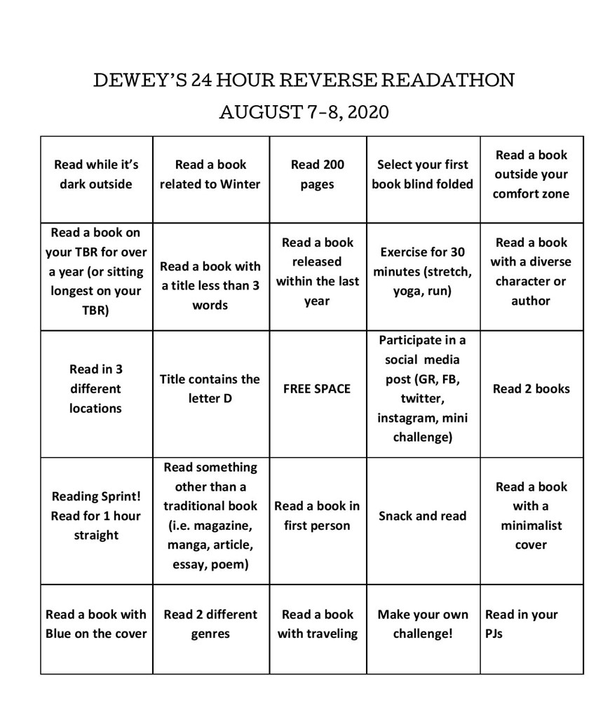 Dewey’s 24h Read-a-thon is a twice yearly event of 24 hours of reading fun and talking books with others. This reverse edition means that the start times have been put 12 hours earlier – thanks for that, it is now in the middle of the night. There are some challenges and there is a bookish bingo.