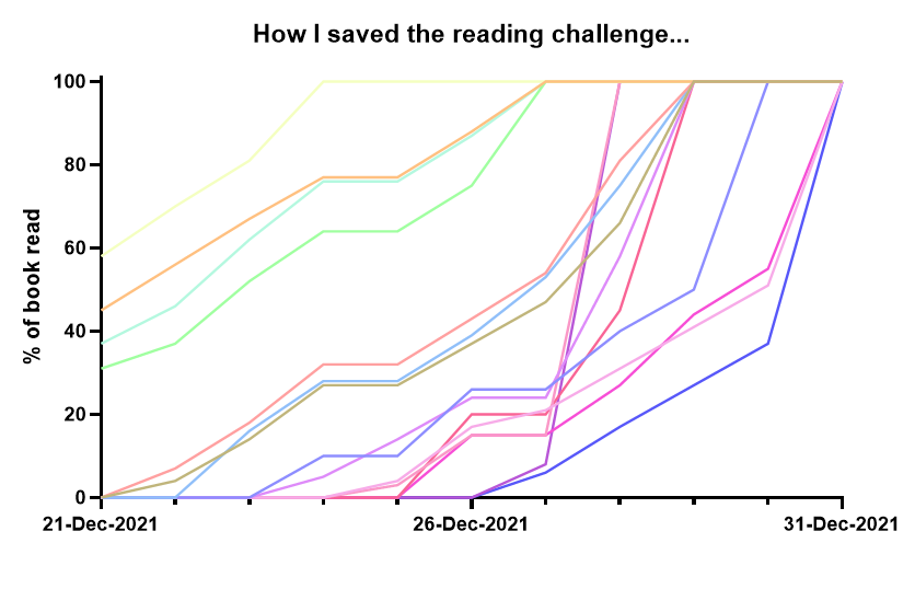 Outwardly, I presented with confidence as I am known to do a last hurrah in the final week of December. On the inside, however, I was having some serious doubts. It was not like I had not tried to read in the previous months, to no avail. But as we like to say, a challenge would not be a challenge if it is not a challenge, so I set out and gave it a try. Only one condition for the books, they needed to fit my ROOT (Read Our Own Tomes) challenge (obtained prior to the start of 2021). Before going through some stats, let’s just say it was a blast. It was much better than anticipated, I finished with a couple of hours to spare, and most importantly I’m back to reading it seems. I can’t start to express how happy this is making me.