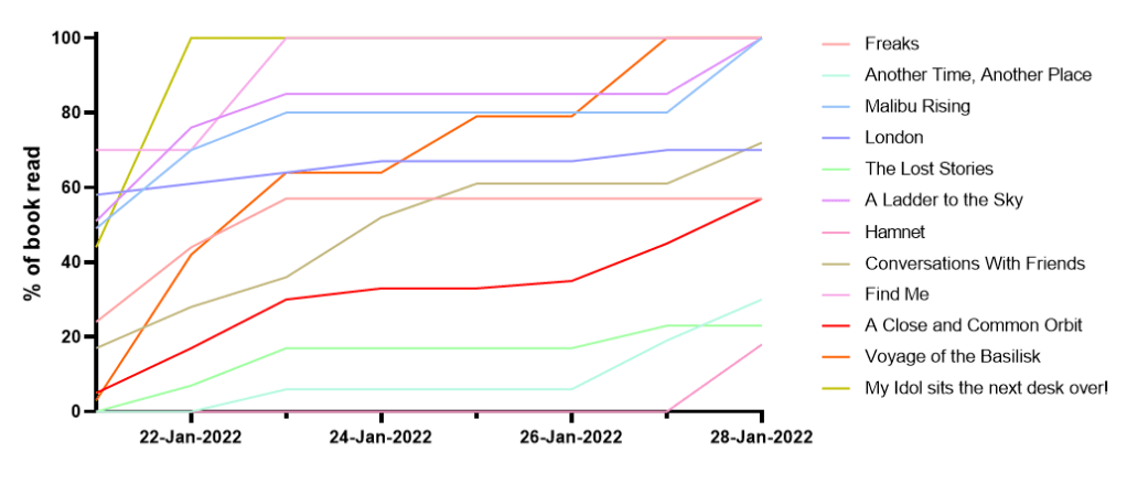 This week, for some reason, I ended up mostly reading contemporary fiction, but nothing really stood out for me. It’s one of those weeks. Let’s see what next week will bring!
