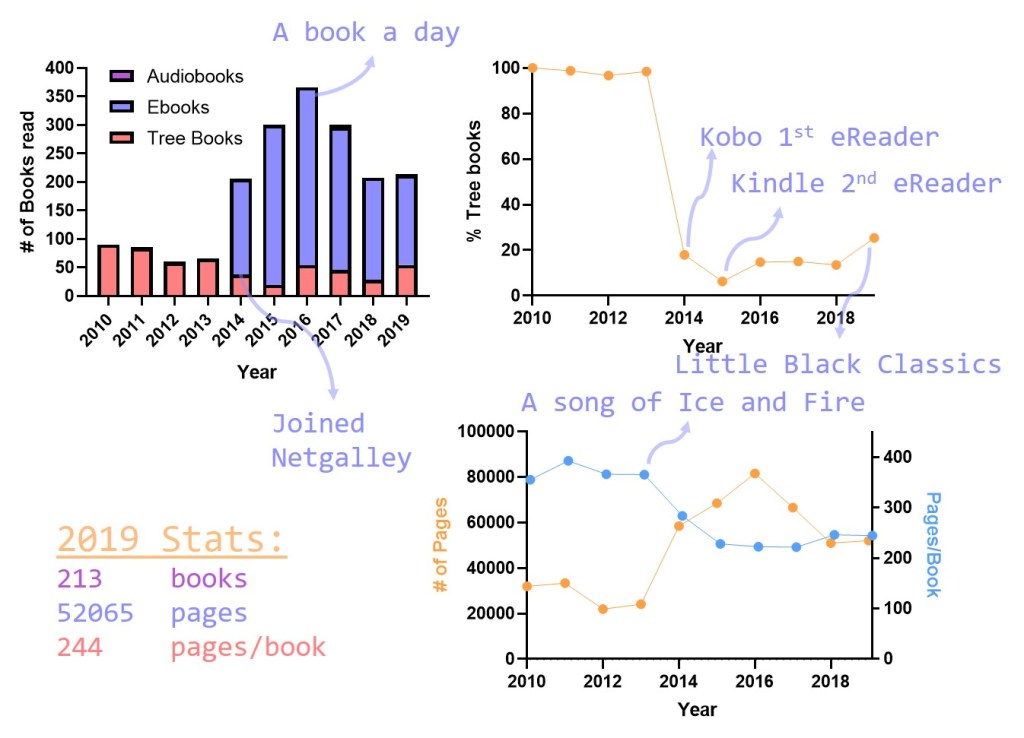 Since 2019 marked the end of a decade (for most of which I had been keeping track of my books), I wanted to take a look to what these data could tell me, in particular with regard to changes. In 2010 I was still in high school and now I am nearing the end of my PhD, I joined Netgalley in 2014 and got my first Kobo eReader that year. Since 2015 I have been making regular trips to London bookstores where the choice of English books is far superior to what I get at home. How do these and others reflect on my books?