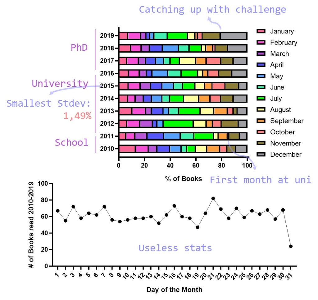 Next, I took a closer look at each year, so that I could see when all the books were read, dividing everything per month and plotting the relative amount of books for each period. Surprisingly – or maybe not, the month I read the absolute minimum in the last decade was October 2011 aka my very first month at university (I remember I was reading a book by Karin Slaughter at the time concerning murders on a college campus which was not ideal as I had just moved onto the university campus myself). Patterns vary a little from year to year, but still I would like to point out there are seemingly to small reading slumps a year; one around March and another around September. I haven’t been able to find a real explanation for that one, to be honest. 2015 was the year when my reading was spread most nicely over the entire year, resulting in a rather low standard deviation (a statistical measure to determine how much variation there is in a sample – lower values means less variation).