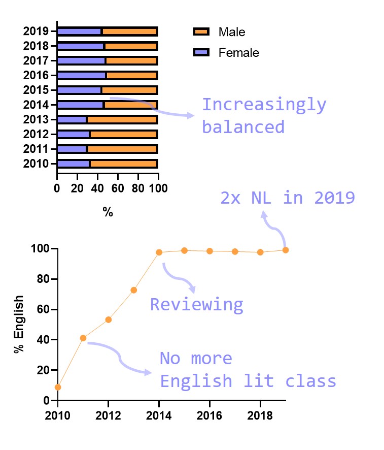 I also looked at gender balance, which currently stands around 50%. However, I was actually quite surprised to find that it was so unbalanced in the beginning of the decade (I had not expected this – one of the fun things of collecting data).