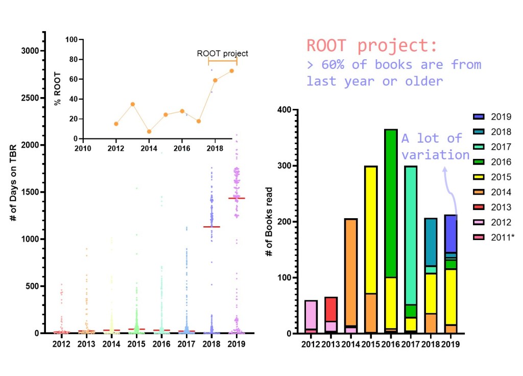 I have increasingly become aware that there was a problem and it was called my TBR. New books kept arriving at a faster pace than even I could read them. So, starting in 2018 I put in an effort to pick up these older books, so called ROOTs (short for Read Our Own Tomes; originally from LibraryThing), and clear them from my shelves. As you can appreciate, percentages have gone up quite drastically. This becomes even more clear when looking at the number of days a book spend on the TBR before it was read in a certain year. This used to be quite low – new books scream loudest and get picked up soonest; but since the start of the project this number has also gone up.